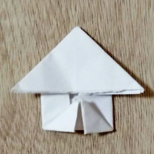 完成したカエルの折り紙を指で下に押し付けてから離すと