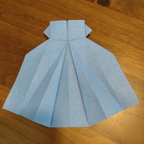 だんだんドレスの見た目になっていくのを見て、途中で胸に折り紙を当てて「わたしには小さくて着れないっ♪」とテンション高めの自虐が入りました(笑)