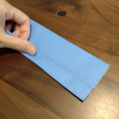 裏返して、上のヒラヒラだけを右から2cmあたりでさらに谷折りします。